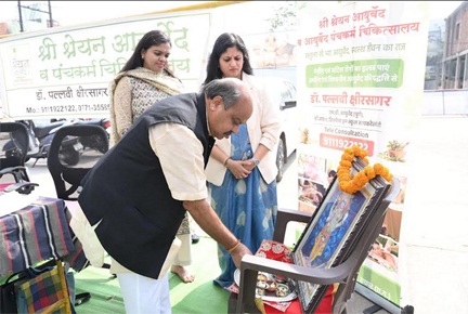 Purandar Mishra inaugurated the free Ayurvedic health camp by lighting the lamp.